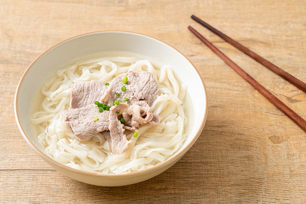 4.組裝上桌:放入烏龍麵、肉片、青菜,最後擺上溏心蛋、撒蔥花,可再滴少許麻油提香——完成!