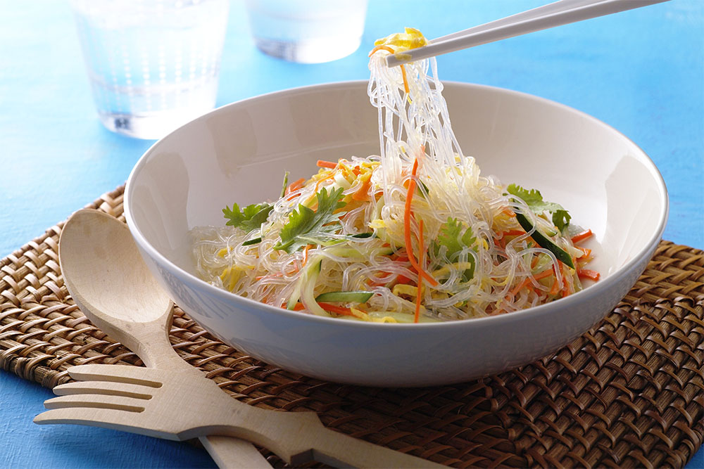 使用帶殼綠豆澱粉製作,完整保留天然葉綠素,使粉絲呈現清爽自然的綠色調。口感爽脆彈牙,不易糊爛,即使久煮久燉仍能保有完美彈性。純粹原料製成,能品嚐到綠豆本身的自然清香。
