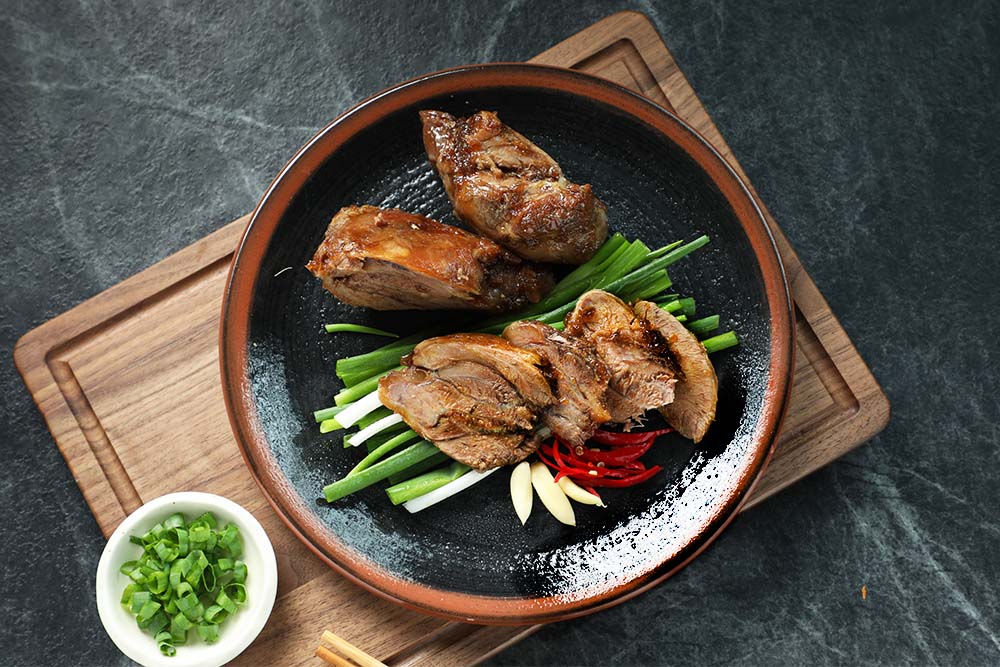 滷豬腱選用台灣豬前腿活動量高的腱子部位,肉質結實、筋膜均勻,富含天然膠質。低油脂卻經長時間燉滷後轉化出滑潤口感,層次豐富不乾柴。調味不添加防腐劑與化學香精,改以白芷、砂仁、小茴等天然漢方慢滷,鎖住肉香與鮮甜。冷食清爽、復熱後更添芝麻香油與米酒香氣,無論日常加菜或年節團聚,都能輕鬆上桌。