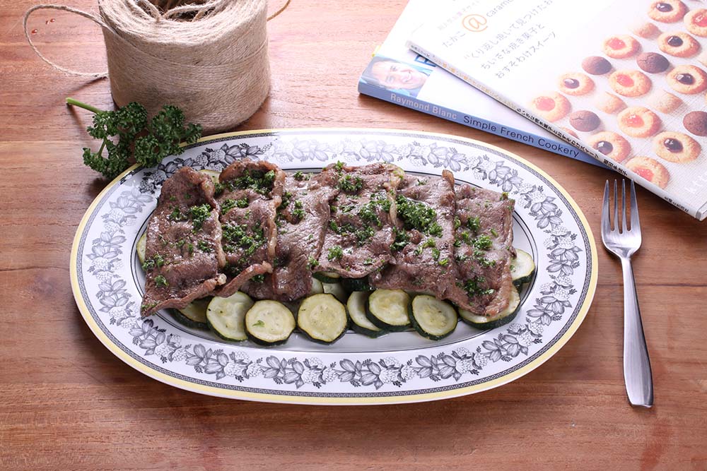 食材:澳洲嫩肩里肌薄片 1包、綠櫛瓜 300g、黃檸檬 1顆、新鮮巴西利 200g、橄欖油/海鹽/黑胡椒 適量