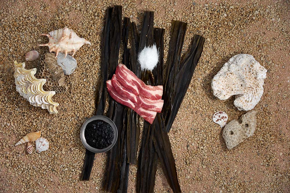 在深海中追尋旨味,透過鹽的礦物質、日本的日曬昆布與慢醃,本該油膩的五花卻超乎想像的清甜回甘,肉質不僅不會變得乾柴,黑豚五花豐富的油脂還能轉化成迷人的香氣。當鹽和昆布經過炭烤,反而令人直觀感受到的「鮮UMAMI」!雖然在系列醃肉中配料最簡單,但其風味卻是相當不容忽視的存在。