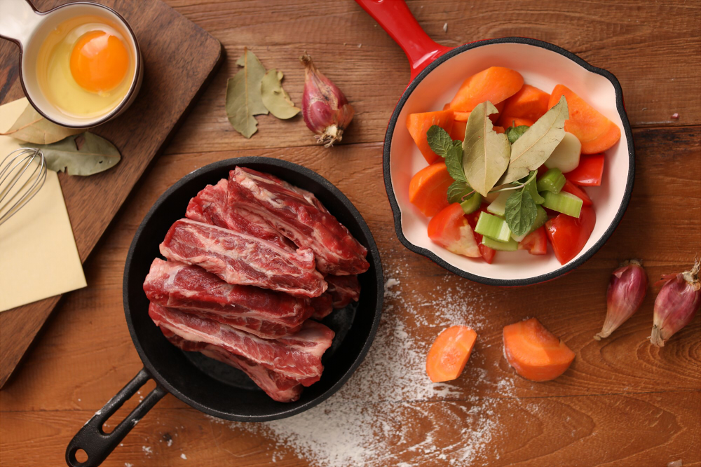 材料:牛肋條1.2kg、高湯或水1000cc、紅酒500cc、洋蔥1顆(切碎)、紅蘿蔔麵2根(切碎)、馬鈴薯3顆(切塊)、蘑菇300g、培根200g、麵粉3湯匙、大蒜3瓣(切碎)、百里香2根、迷迭香1根、月桂葉1~2片、番茄醬3大匙、鹽1茶匙、胡椒粉½茶匙