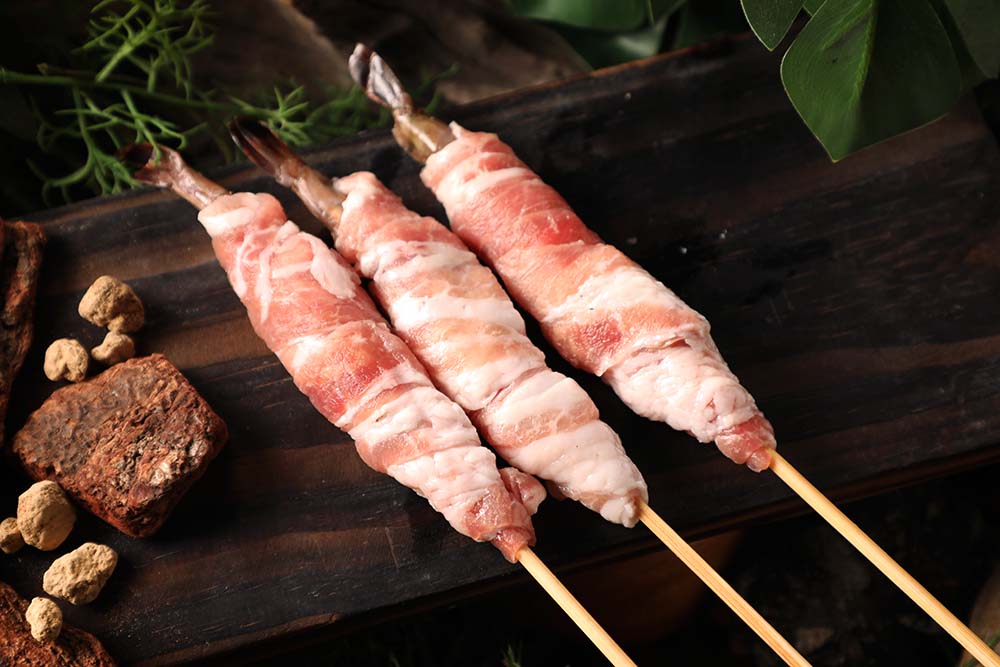 嚴選肉質緊實的剝殼草蝦,手工串捲鹹香微脆的台灣豬培根與五花肉,經加熱後油脂融化、香氣四溢,蝦肉吸收肉香,口感層次從外酥嫩到內Q彈。無需調味即可上桌,氣炸、香煎或炭烤都美味,是烤肉趴、露營野餐、日常加菜的超人氣選擇!也可搭配照燒醬、蜂蜜芥末等醬料,自由變化更對味!