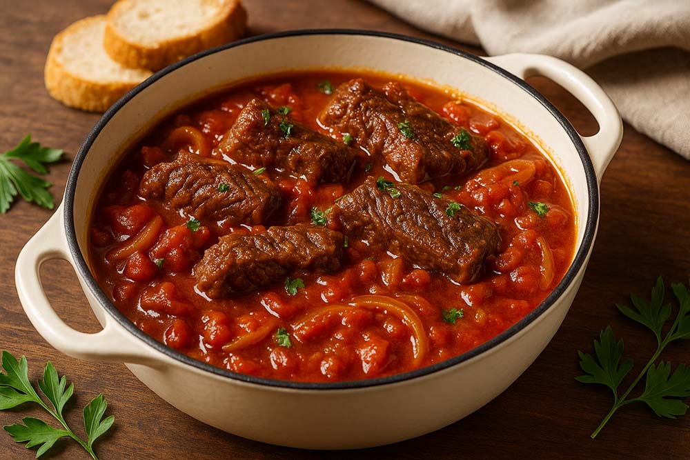 食材:牛肋條 600g、牛番茄 3顆、洋蔥 1顆、蒜頭 5瓣、薑 3片、番茄糊 1大匙、月桂葉 1片、水或高湯約 800ml、鹽 適量、黑胡椒 適量、糖 約1小匙、油 適量