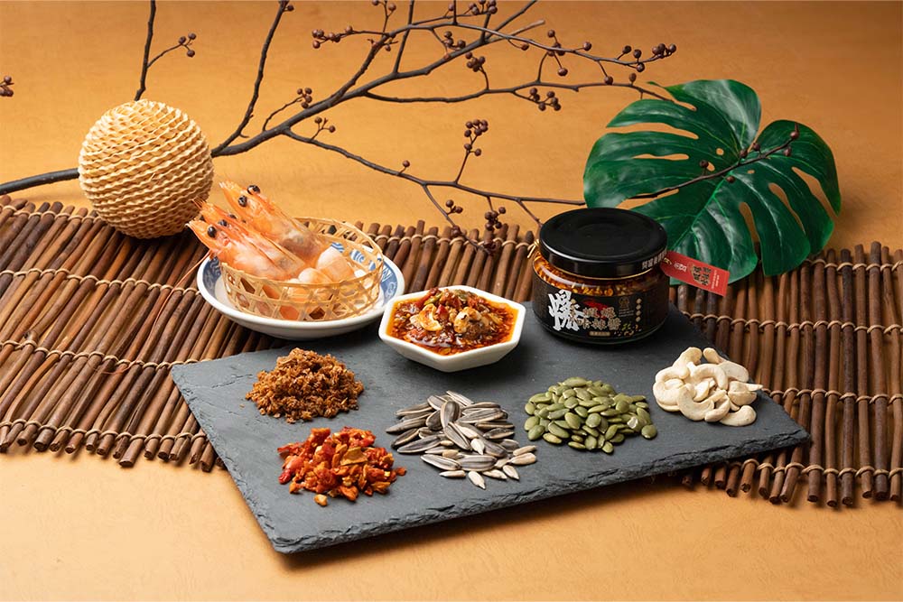 濃郁蝦香與四大優質堅果(葵花子、腰果、白芝麻、南瓜子),不僅將香氣提升更高層次,細煸蝦末與堅果的爽脆口感,刷新嗜辣老饕對辣的極限想像!