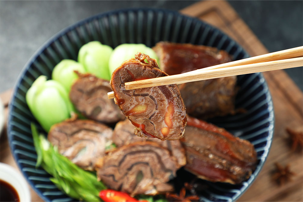 以 15 種以上天然香料長時間低溫慢滷,讓風味充分滲入肉中。無論解凍後切片冷盤享用,或稍微復熱食用,皆保有「半筋半肉」彈牙口感與濃厚肉香,是一道耐吃、越嚼越香的經典滷味。