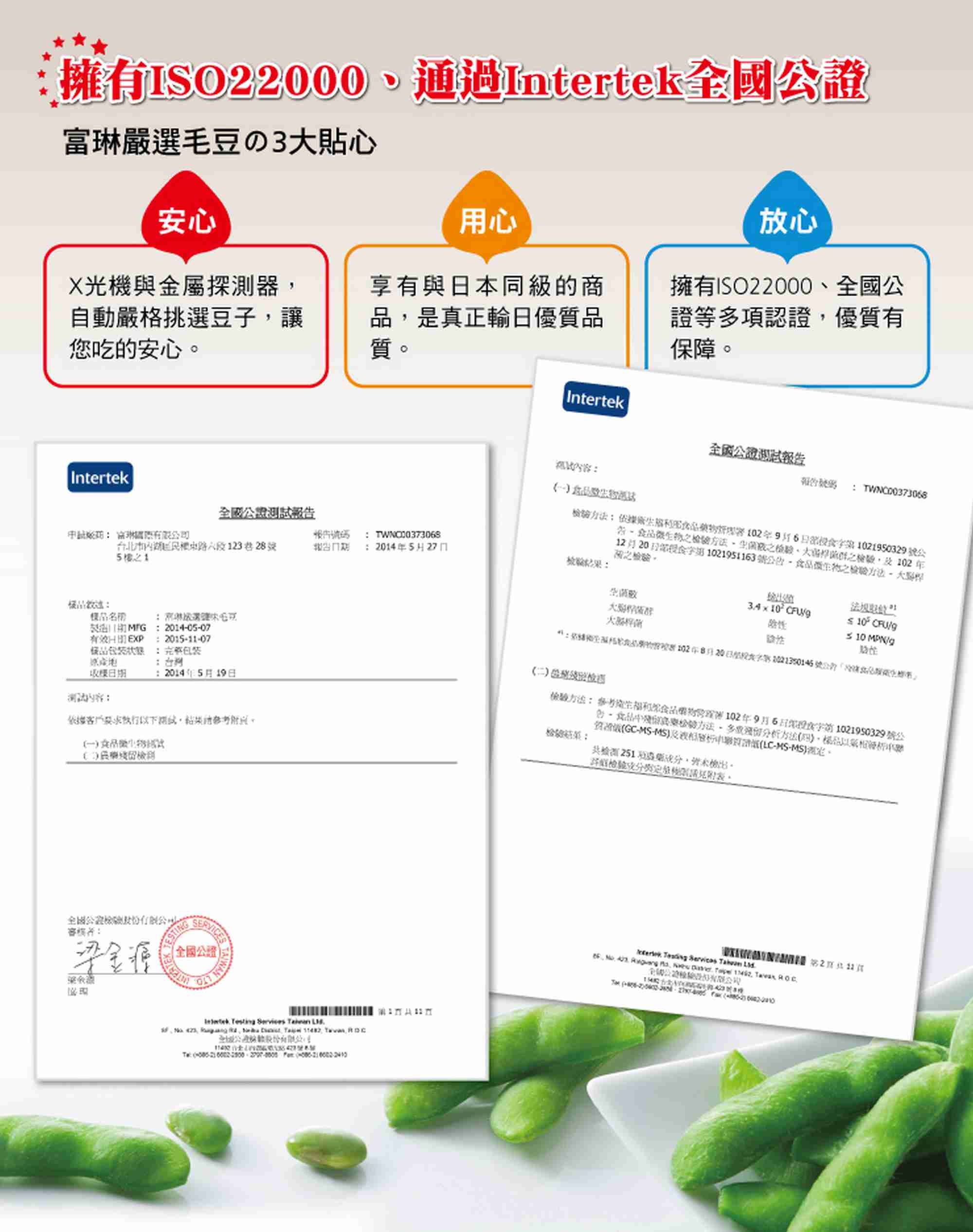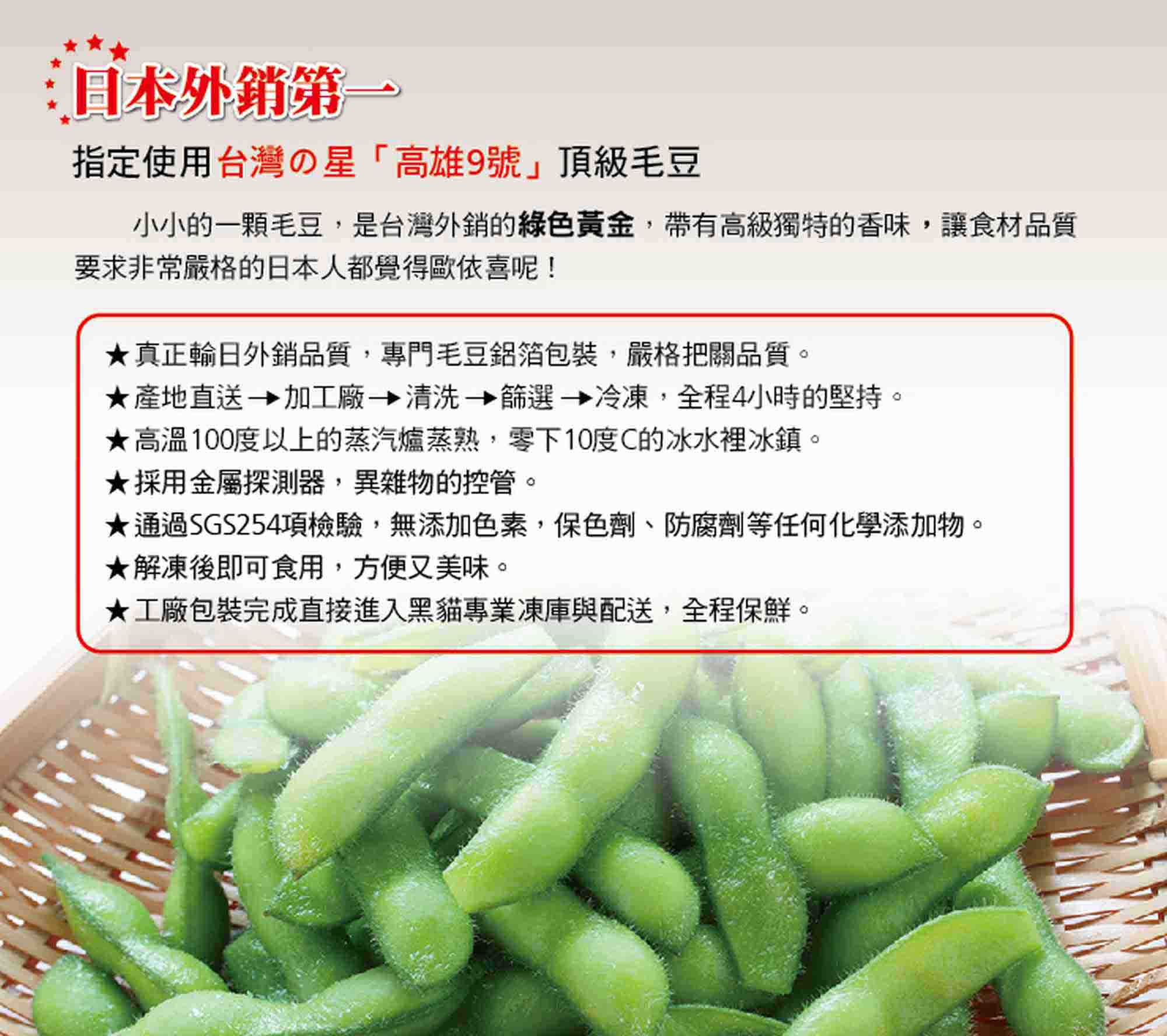 外銷日本的『頂級毛豆–高雄9號』,嚴格把關品質,採收至製成冷凍包裝,全程4小時堅持!通過SGS254項檢驗,無添加色素、保色劑、防腐劑等化學藥劑,新鮮健康,解凍即食,加熱也別有風味,絕對是您夏季零嘴首選~