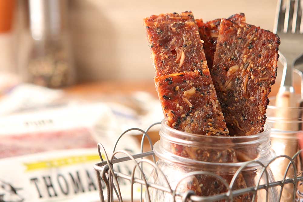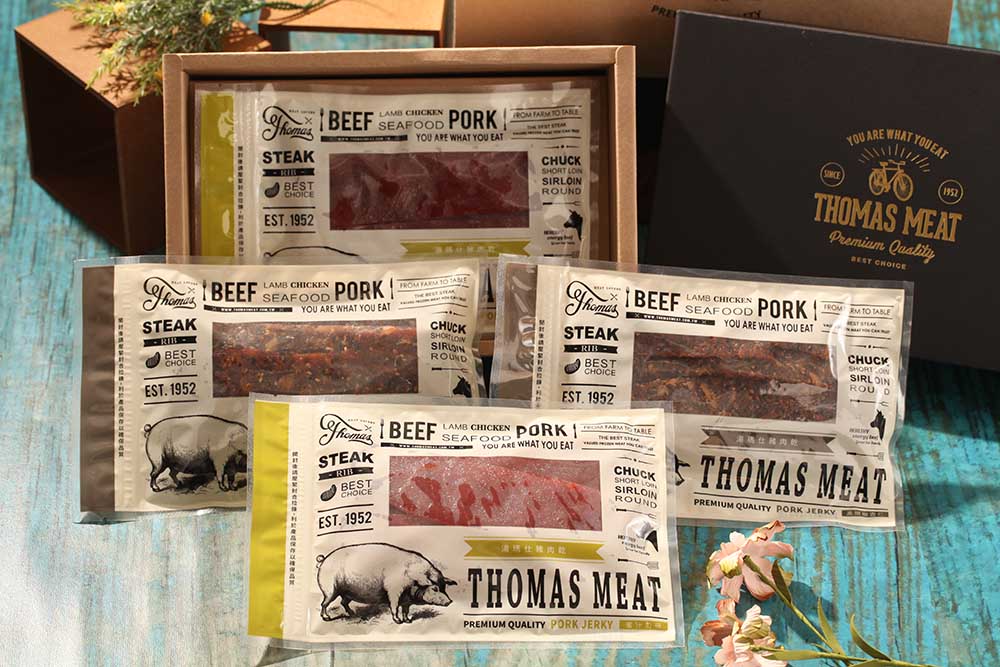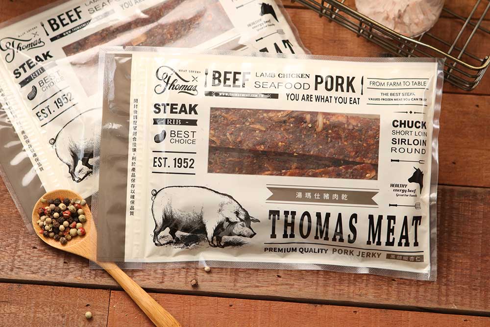 目前湯瑪仕出品的豬肉乾有蜜汁及黑胡椒杏仁兩種口味;