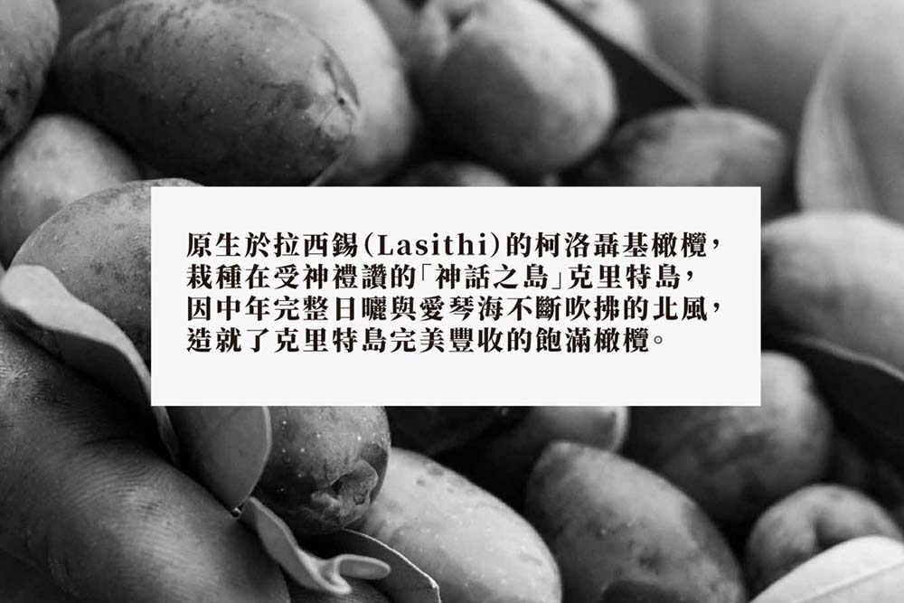 柯洛聶基(Koroneiki)橄欖,以高含油率與細緻香氣聞名,果實雖小卻風味濃郁,能壓榨出香氣層次豐富、酸度極低的頂級初榨橄欖油。栽種於被譽為「神話之島」的克里特島,這裡陽光充沛、土壤肥沃,並長年受愛琴海北風吹拂,形成絕佳的栽培環境。得天獨厚的氣候條件,使橄欖果實均勻成熟、油質純淨,呈現出自然果香與溫潤辛香的完美平衡。