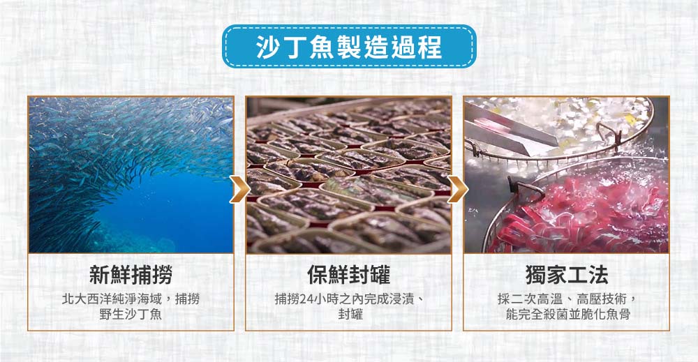 嚴選北大西洋純淨海域捕撈野生沙丁魚,24小時內兩次高溫、高壓技術完全殺菌並脆化魚骨,再運用特殊浸漬技術,製作出成分天然、層次豐富且擁有獨特風味的魚罐頭。