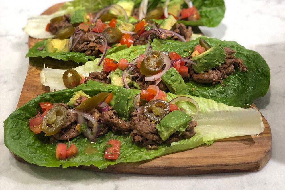 A.將蘿蔓生菜鋪於盤底,依序放入墨西哥風味肉片、酪梨切片、墨西哥番茄辣醬、墨西哥辣椒切片、香菜葉、