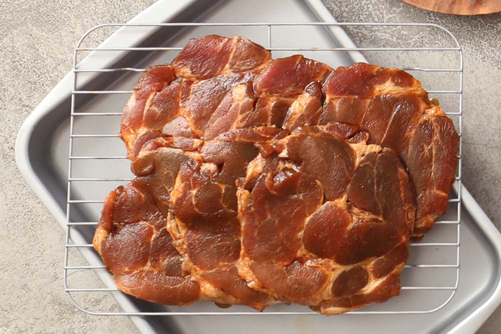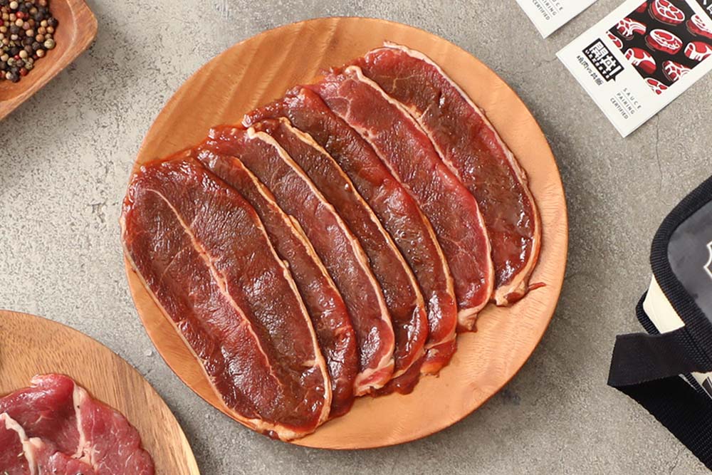取尼加拉瓜牛隻肩胛部板腱,中間橫越一條Q彈的筋,肉品吸飽香氣濃厚的燒肉醬汁,口感扎實,品嘗軟中帶脆的絕妙滋味。精切約0.4cm厚度,不只中秋烤肉適用,夾進三明治也有不一樣的美味。
