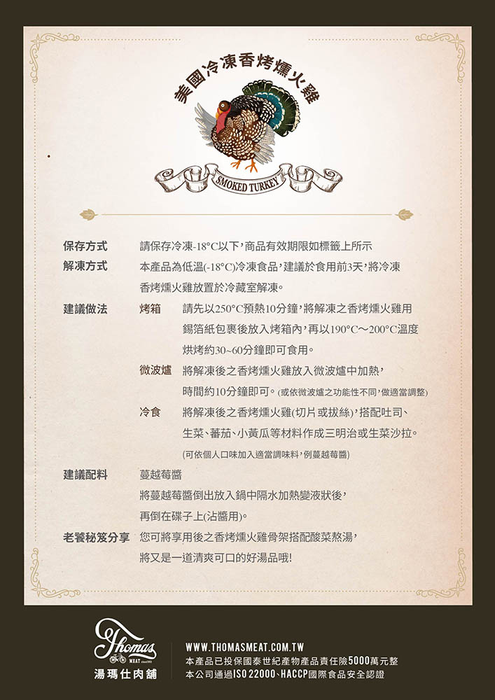 煙燻火雞:冷凍-18℃可保存180天,詳情請見商品標示(訂購時商品至少距有效日期60天以上)