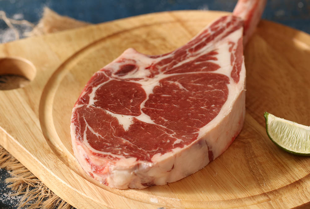 取牛隻肋脊部位,運動量較少,肉質細緻僅次菲力,油花如雪花般遍布,建議將肉品煎烤至5~7分熟後切下肉品起鍋,帶骨處留在鍋中繼續煎烤到「恰恰」,金黃的表面與汁多味美的內裡,骨頭邊筋膜焦香酥脆,直接用手拿起來啃,這就是大口吃肉的豪邁!