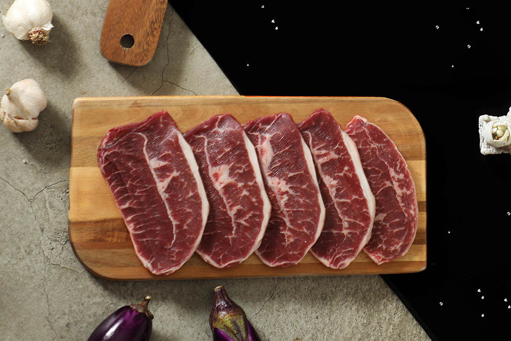 選自肩胛部位口感軟嫩的板腱,雪花般美麗的細緻油花,中間帶著一條Q彈的筋,有著不同的層次和口感,薄切0.6~0.8公分的黃金燒烤厚度,不只是家庭烤肉聚會的最佳選擇,日常早餐夾三明治也很match!
