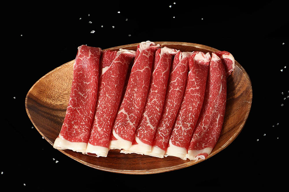 雪花培根牛肉片取自牛的胸腹肉,俗稱「牛五花」,瘦肉中帶有油脂讓吃起來的口感不柴不膩,軟嫩的肉質除了適合拿來烤肉,也可用來涮鍋或做成香嫩滑口的牛肉丼飯。