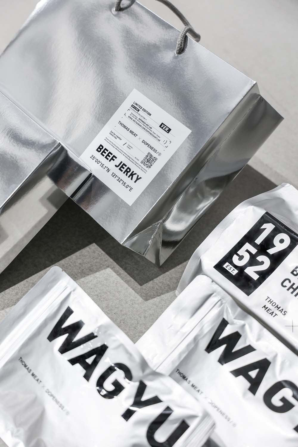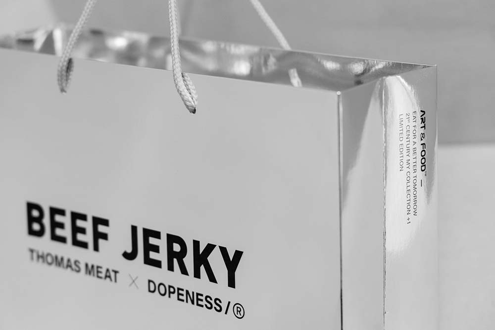 DOPENESS ART LAB獨家設計,充滿未來感的銀色風格,加上用色、印刷、剪裁…各種細節的呈現。透過湯瑪仕肉舖和牛肉乾與DOPENESS ART LAB的跨界合作,傳統零食也能充滿藝術,美味與時尚兼具。